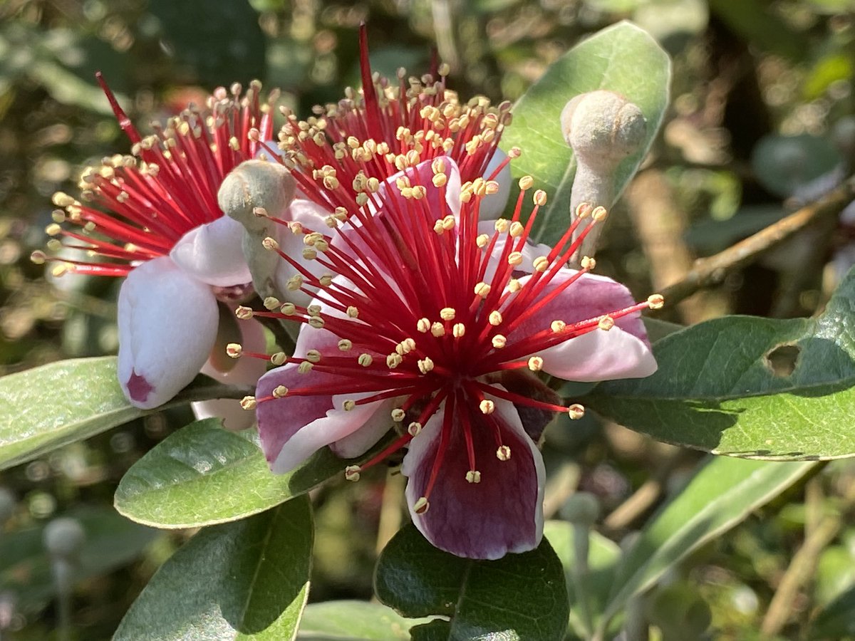 真っ赤なオシベが特徴の フェイジョア 花いろいろ